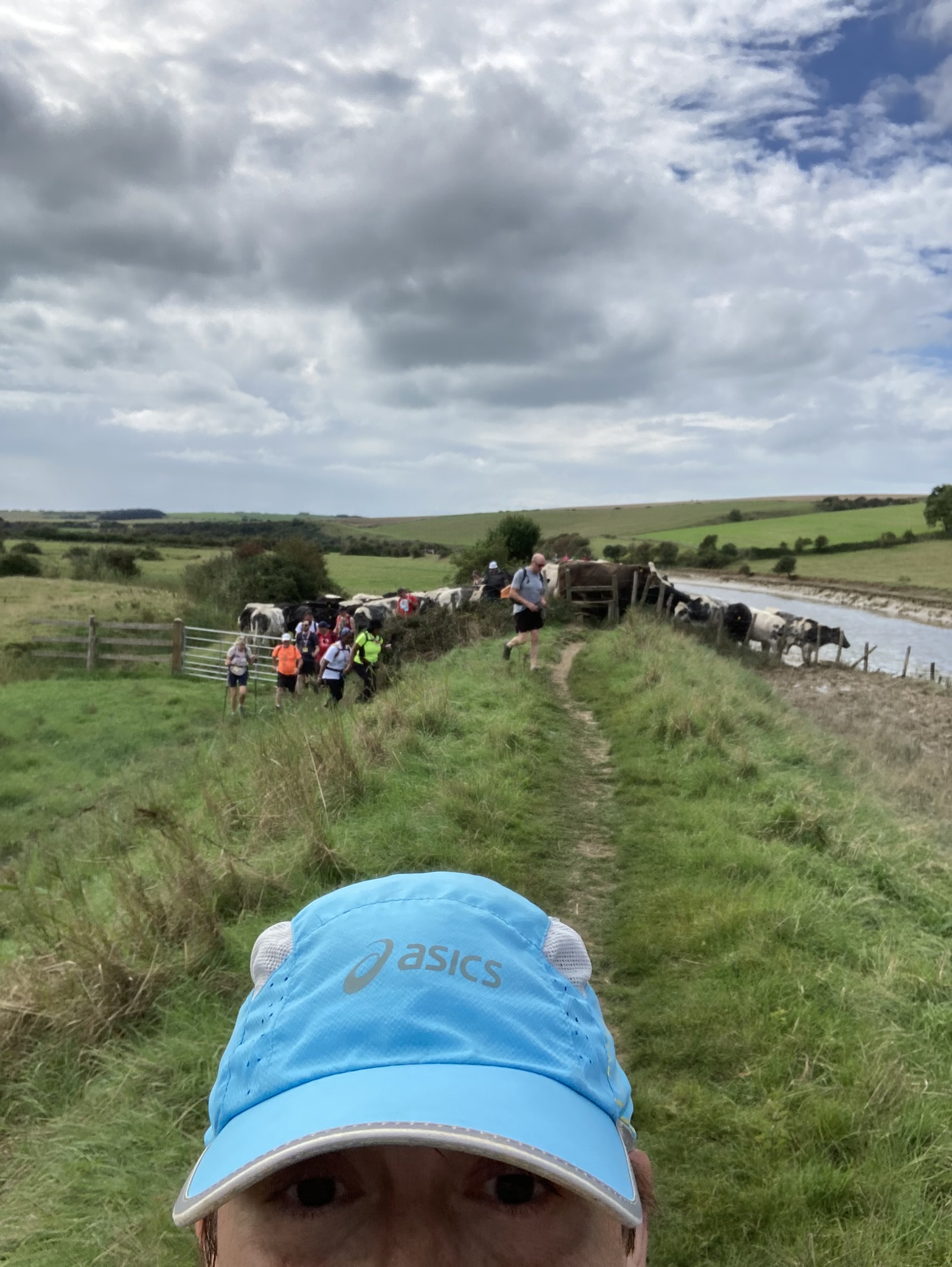 The next bit was the Seven Sisters a series of steep ascents and descents and of course this is when it started to get really hot. I had not planned my hydration and nutrition as I would normally do and I was just winging it. I had my little timer to vibrate every 10 mins to remind me to hydrate but had not bothered to set it or turn it on. This resulted in me getting very hot, very dehydrated and generally feeling vomity and rubbish. After this was a long flat bit but as I was not in great shape at that point I was much slower there than I would normally be which was frustrating, I also fell over twice tripping over little metal bits sticking out of the ground. This where there there were the first group of cattle congregating around a stile. They were, understandably, not over impressed with a load of people going through their land and were not going to move for anyone. I reached the first aid station, felt a bit better and then carried on.